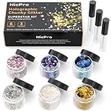 Nicpro Holographic Chunky Glitter Set 6 Colors with 3pcs Fix Gel Blue Pink Silver Gold White Glitter